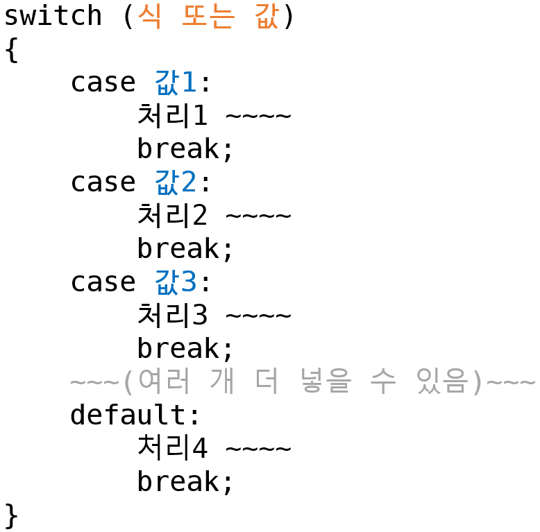 - switch 문은 여러 개의 if else 문을 사용하는 것보다 가독성이 높고 코드를 간결하게 만들어 줍니다.