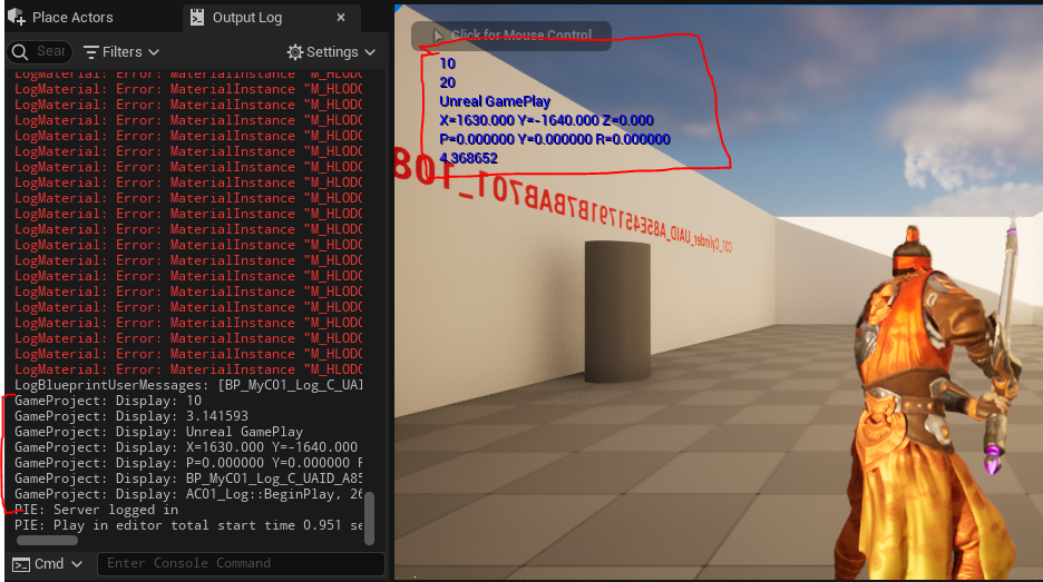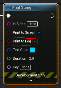 블루프린트에서 PrintString을 진행하면 위와같이 OutputLog 창과 Screen에 출력된 로그를 볼 수 있는데