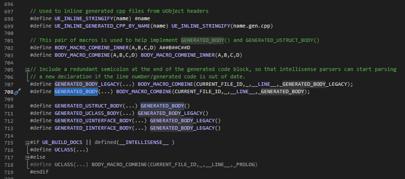 아래 사진을 살펴보면 708번 째 줄에 GENERATED_BODY() 매크로가 있습니다.