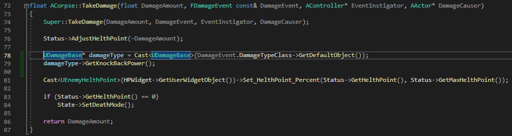 DamageType을 사용하기 위해서는 AActor에 있는 TakeDamage함수를 오버라이딩 하고 DamageEvent의 DamageTypeClass를 받아 기본 오브젝트를 받아 사용해야한다.