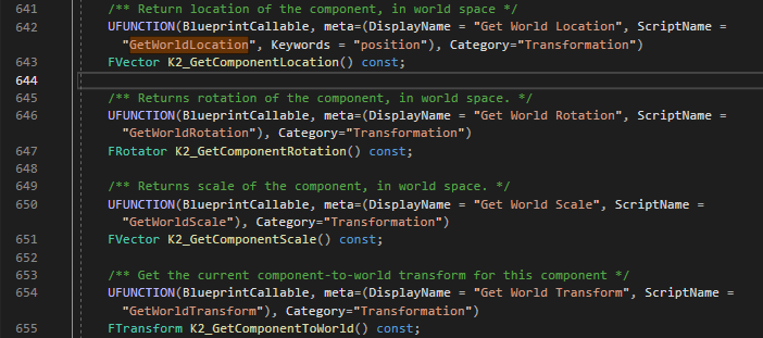 SceneComponent에서 GetWorldLocation을 찾아보면 ScriptName="GetWorldLocation"을 찾아볼 수 있다.