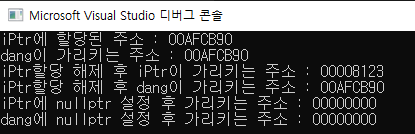 cout << "iPtr할당 해제 후 dang이 가리키는 주소 : " << dang << endl;